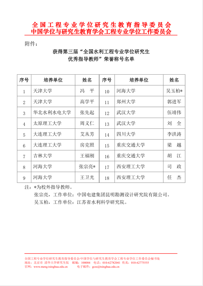 文件公布了18名 “全国水利工程专业学位研究生优秀指导教师”、14名“全国水利工程专业学位研究生教育先进个人”和12名“全国水利工程专业学位研究生实践优秀成果获得者”,其中我院共4名师生受到了表彰。伍靖伟、刘全2位老师荣获第三届“全国水利工程专业学位研究生优秀指导教师”;肖宜老师荣获第七届“全国水利工程专业学位研究生教育先进个人”;管光华老师指导的2017级专业学位硕士研究生钟稞同学荣获第四届“全国水利工程专业学位研究生实践优秀成果获得者”称号。