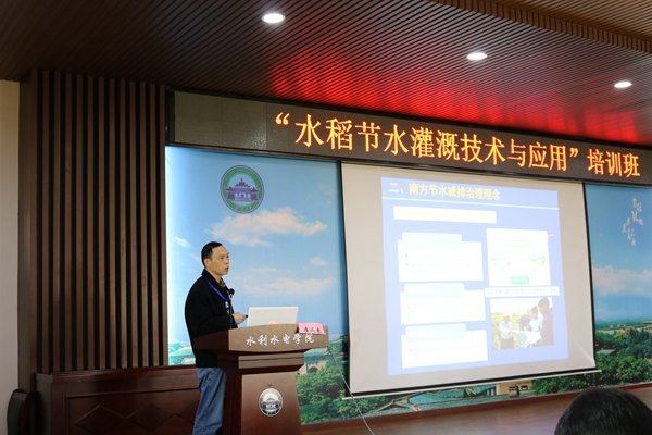 开班仪式结束后,茆智院士首先开始为期两天的培训,研究团队成员崔远来教授、董斌教授和罗玉峰教授依次授课,来自黑龙江的吕纯波教高和广西的李新建教高分别介绍了水稻节水灌溉推广应用经验,并与学员交流讨论。
