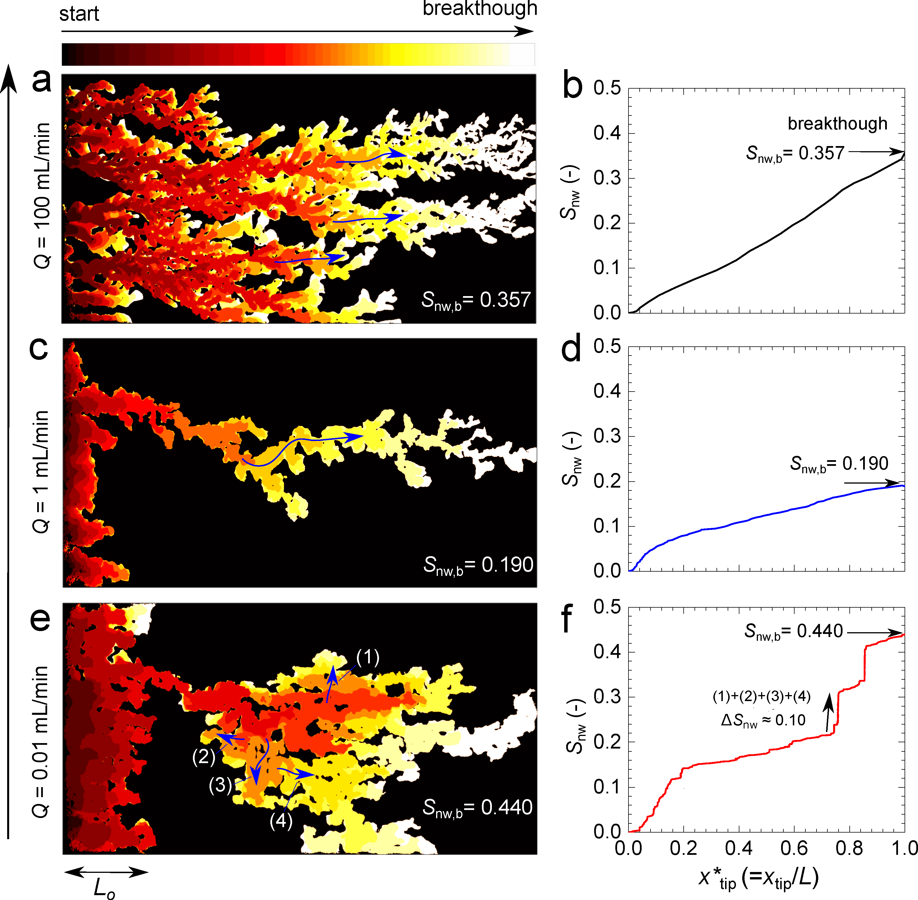 图中揭示了粗糙裂隙中水驱油过程呈现出强烈的指进现象(指流)。传统理论认为随着注入流速的增加,被水驱替的油相饱和度也增加。然而,我们的研究发现,当流速增加到一定程度时,驱替效率会显著降低(c)。基于流体界面特性的拓扑形态学分析,我们发现驱替前沿的特征流速达到最大值,导致入侵流体提前突破,进而显著降低驱替效率。