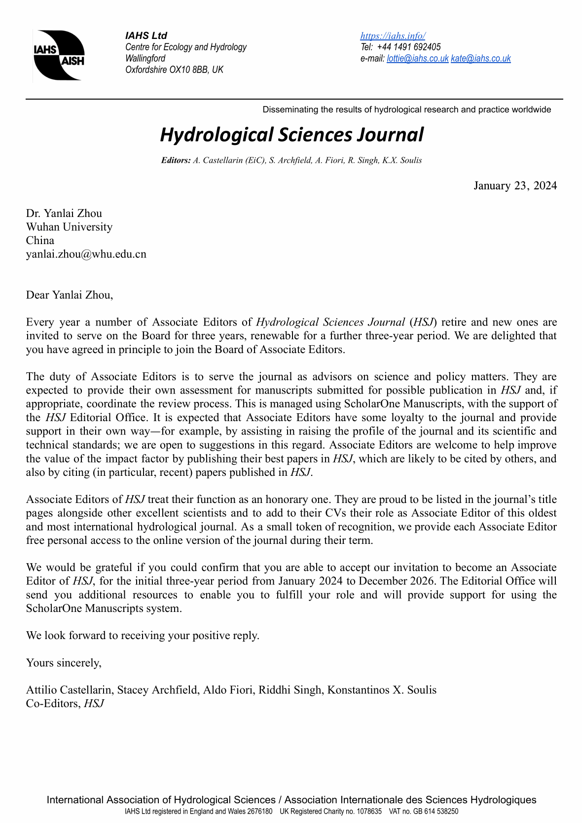 近日,水资源工程与调度全国重点实验室、威尼斯wnsr888周研来教授受国际水文科学协会(International Association of Hydrological Sciences,IAHS)官方期刊水文科学杂志(Hydrological Sciences Journal,HSJ)主编Attilio Castellarin教授邀请,担任HSJ的副主编(Associate Editor),任期三年(2024~2026)。