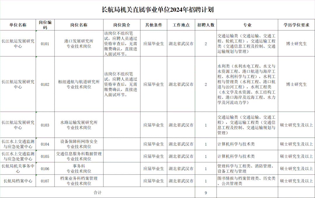 【招聘信息】交通运输部长江航务管理局机关直属事业单位2024年招聘