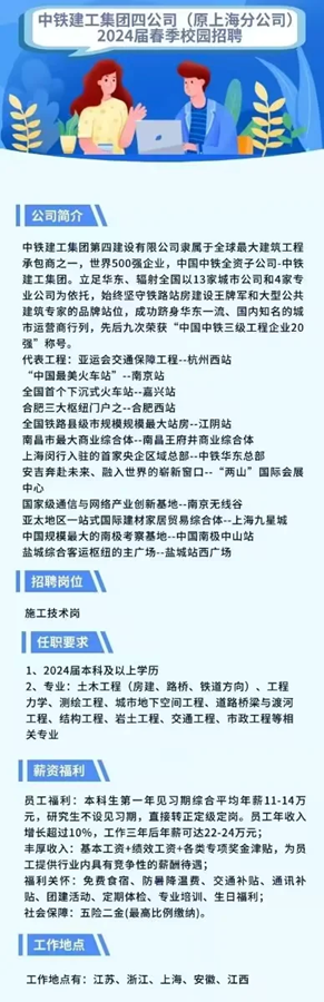 【招聘信息】中铁建工集团四公司(原上海分公司)2024届春季校园招聘